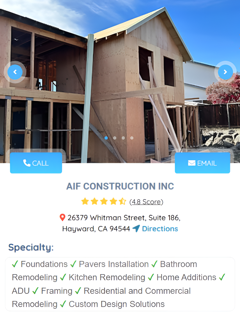 Whether you’re planning a new construction project, updating your home, or need skilled services such as plumbing or electrical work, AIF Construction Inc. is ready to help. With nearly two decades of experience, we proudly serve Hayward and surrounding areas, delivering dependable results you can trust.